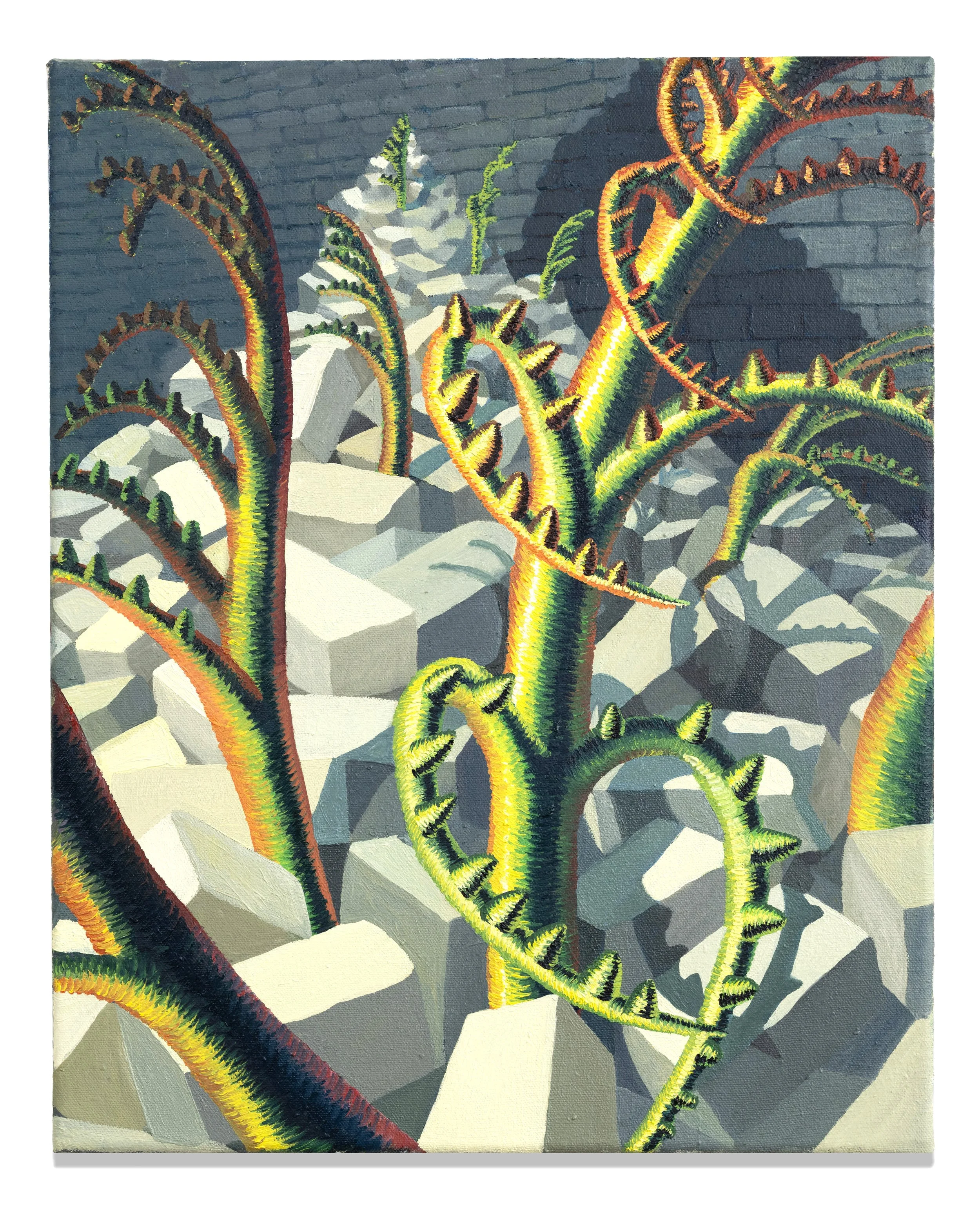 “Vegetation intersects with architectural forms in my paintings to create psychological and sociological symbols. I am interested in public places where people consciously and unconsciously share space and time, how they represent the way we live and feel and how generations build upon one another. As I walk around New York City, I am amazed that anything is able to grow in such a seemingly uninhabitable place, whether it be a weed on the sidewalk or a giant Sycamore tree. Throughout my lifetime, the city has become increasingly unaffordable and difficult for people to live in. Many have left. Many are opting to not have children. The humorist, Fran Lebowitz has famously said “No one can afford to live in New York. Yet, eight million people do. How do we do this? We don't know.” The resilience, tenacity and mystery of city plant life is echoed by that of the working people.