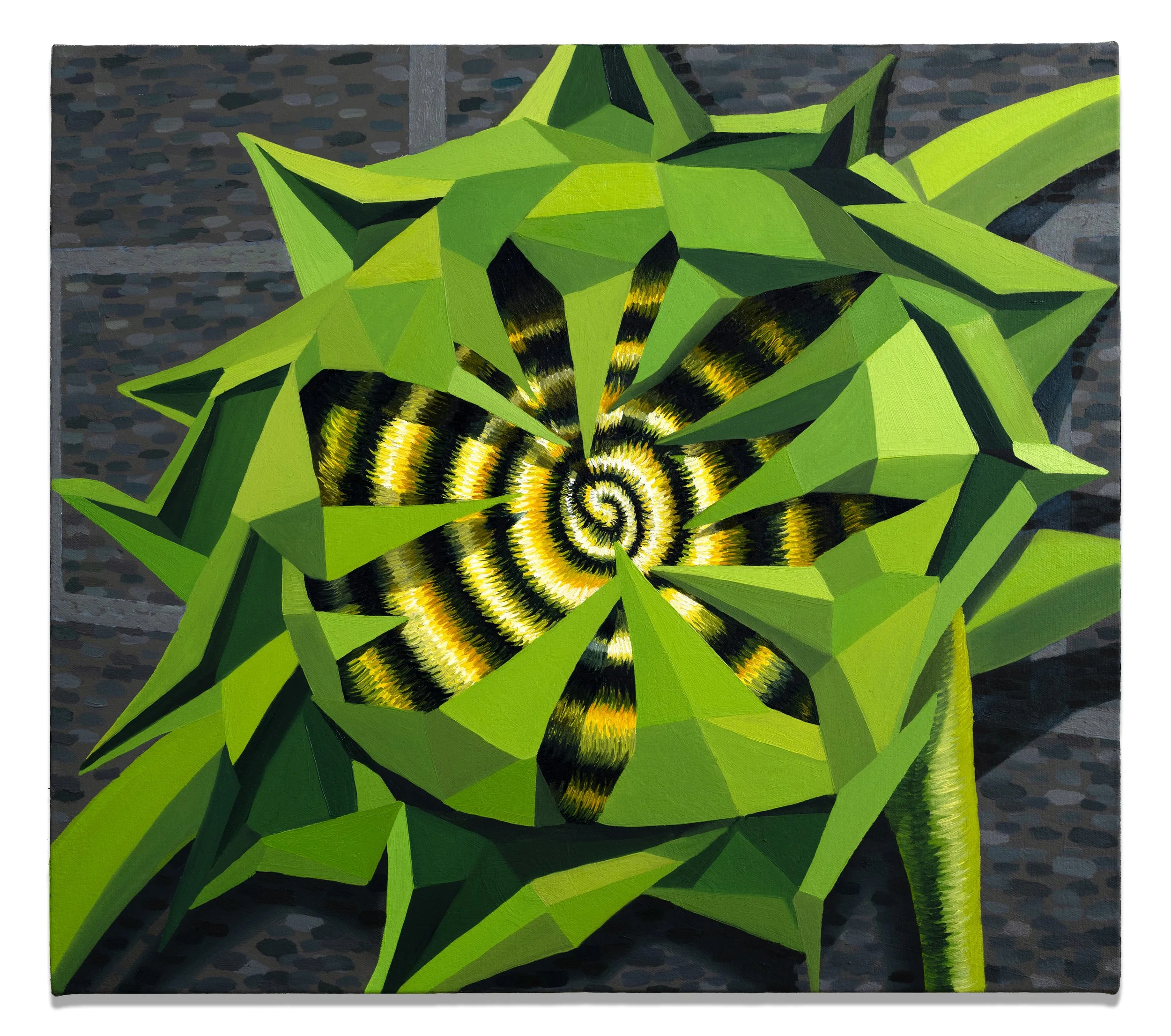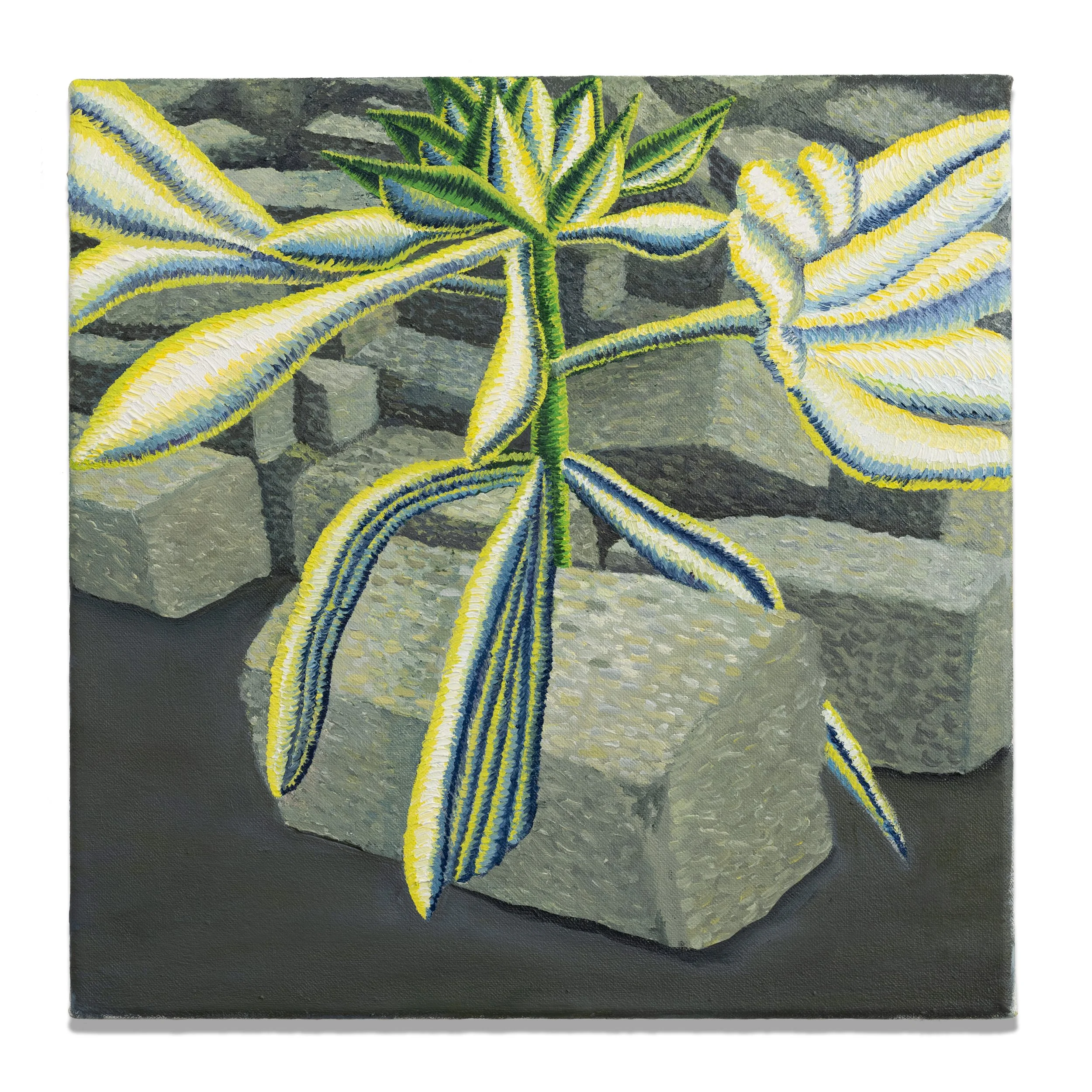 I study plants, walls, fences and cement to identify patterns and rhythms within surfaces and structures. I take my studying further through painting, incorporating imagination and improvisation along the way. Breaking forms into areas of dots, lines, prisms, or tubes of texture, I discover and celebrate the order within each object and invite the viewer in to look closely. My attraction to objects is fueled by unconscious impulses and religious archetypes and themes, particularly those regarding human kinds’ relationship to nature and vegetation as a symbol of resurrection and immortality. As I look and as I paint, I seek sanctity and wonder in an increasingly atheistic, irreverent world.”