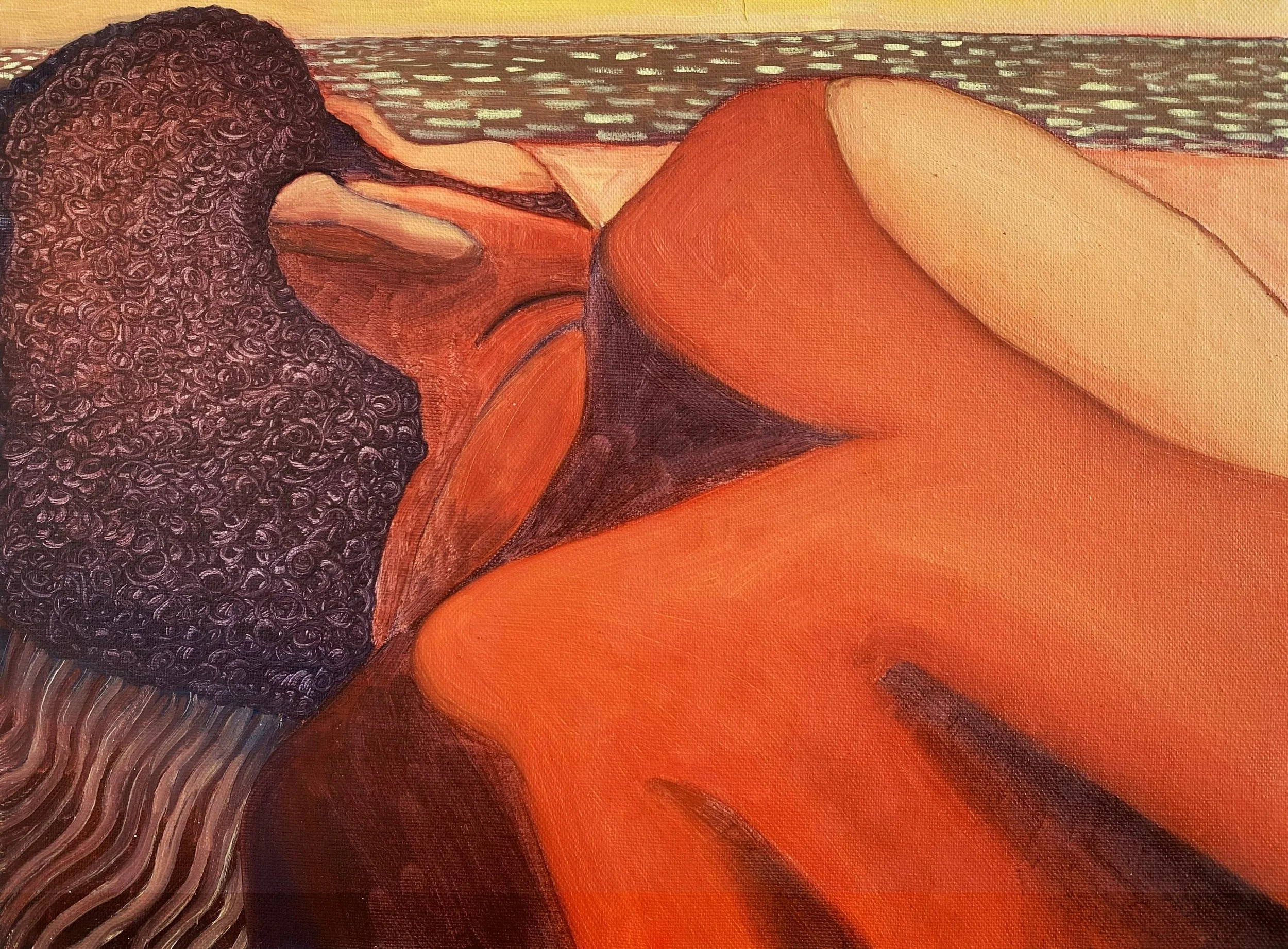 Through cropped compositions, Hurwitz blurs distinctions between figures and landscapes—dunes morph into torsos, and hair blends with grass—creating a fluid interplay between form and setting. His plein air works often serve as the foundation for larger studio pieces, where shifts in scale and perspective emphasize the tension between flatness and depth while leaving narratives intriguingly open-ended.”