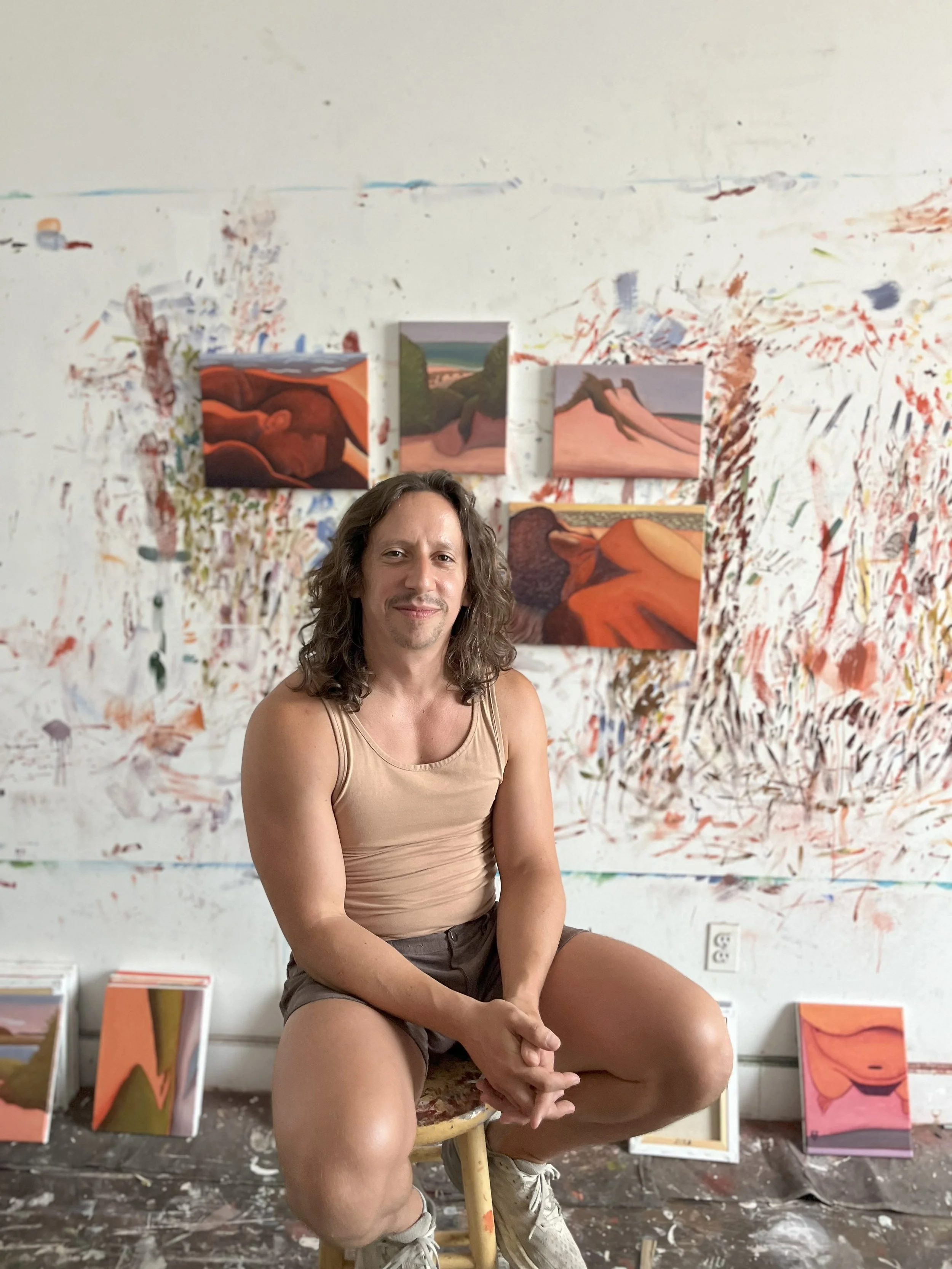 “The overarching theme in Dylan Hurwitz's work is the search for community and connection – in the lives of queer people in particular – and the rituals, places and landscapes that foster all of this. His subject matter is drawn from his everyday life, and he paints from observation, and memory. The resulting works oscillate between landscape, figurative, and abstraction. Dylan’s work is strongly influenced by his ongoing time spent in several locations, including Boy Beach in Provincetown, Massachusetts, as well as Jacob Riis Beach and Fort Tilden in New York City, which he bikes to regularly.